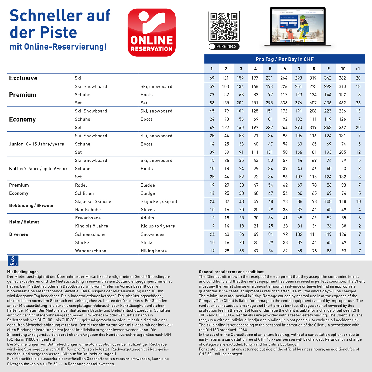 Tages- oder Saison-Miete? Wähle deinen Ski/Snowboard und Schuh mit unserem erfahrenen Personal aus. Profitiere von unserer flexiblen Rental-Abteilung im Eiger Sport in Unterseen.